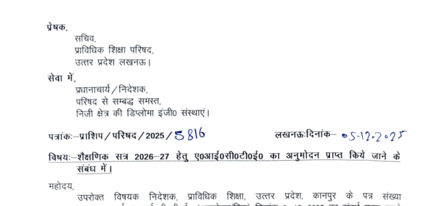 In another communication, the Director of Technical Education, Uttar Pradesh, Kanpur has issued instructions to principals of all government, grant-in-aid, PPP and private polytechnic institutes in the state. This letter also refers to the AICTE public notice (No. AICTE/Regulation Bureau-AP/2026-27) dated November 26, 2025 regarding approval and extension of approval for 2026-27.​