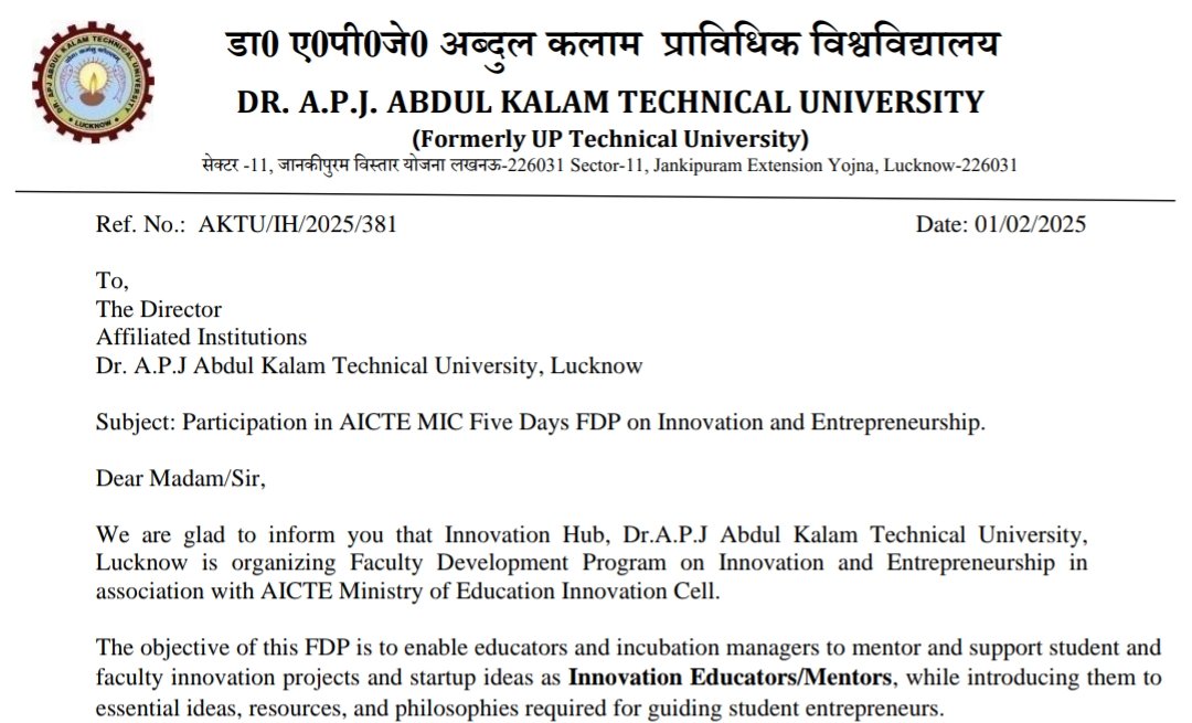 We are glad to inform you that Innovation Hub, Dr.A.P.J Abdul Kalam Technical University, Lucknow is organizing Faculty Development Program on Innovation and Entrepreneurship in association with AICTE Ministry of Education Innovation Cell.