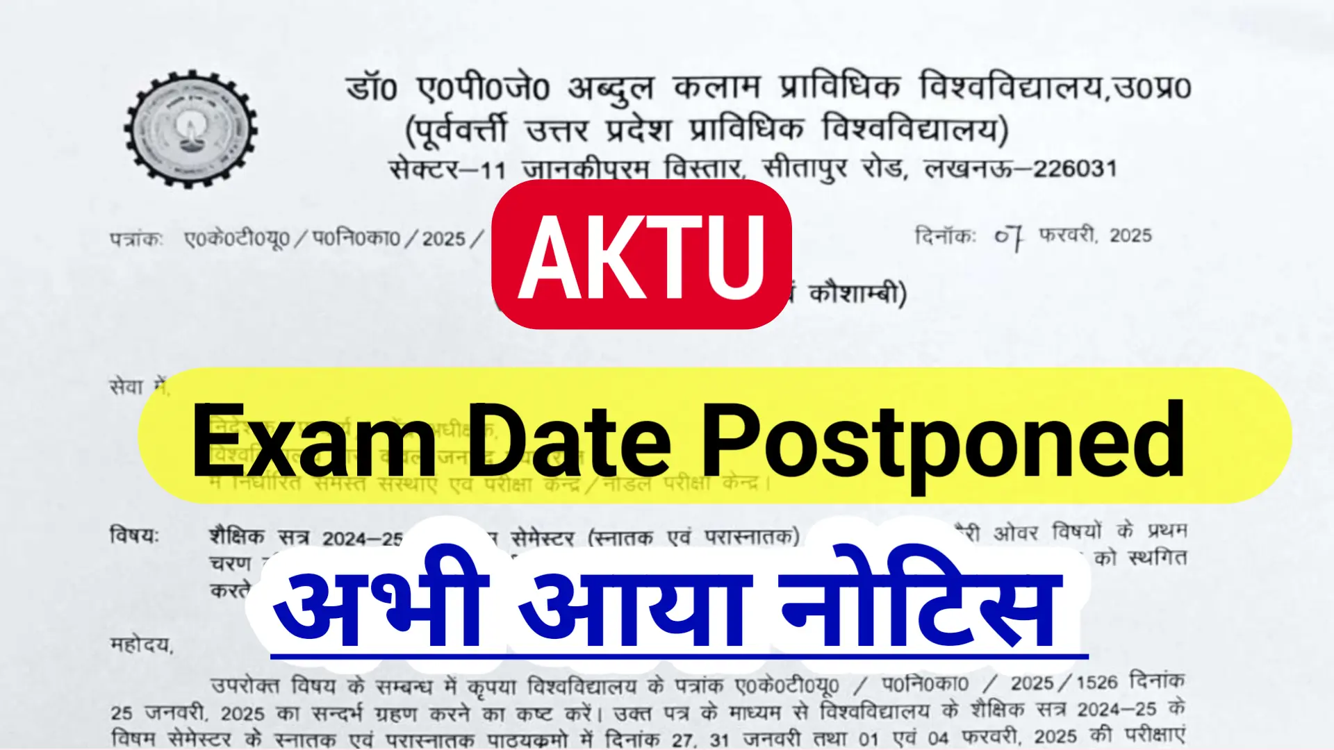 उपरोक्त विषय के सम्बन्ध में कृपया विश्वविद्यालय के पत्रांक ए०के०टी०यू० / प०नि० का० / 2025/1526 दिनांक 25 जनवरी, 2025 का सन्दर्भ ग्रहण करने का कष्ट करें। उक्त पत्र के माध्यम से विश्वविद्यालय के शैक्षिक सत्र 2024-25 के विषम सेमेस्टर के स्नातक एवं परास्नातक पाठ्यक्रमो में दिनांक 27, 31 जनवरी तथा 01 एवं 04 फरवरी, 2025 की परीक्षाएं कुम्भ में भीड़ व यातायात प्रतिबन्धित होने के कारण दिनांक 08, 10, 14 एवं 15 फरवरी, 2025 को निर्धारित की गई थी।