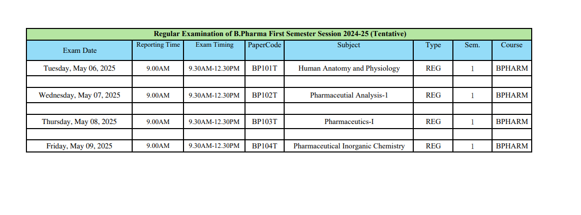 विषयः विश्वविद्यालय की सत्र 2024-25 के विषम सेमेस्टर के बी०फार्म पाठ्यक्रम के प्रथम वर्ष के प्रथम सेमेस्टर में अध्ययनरत रेगुलर छात्र/छात्राओं की परीक्षाओं का सम्भावित (Tentative) परीक्षा कार्यक्रम के सम्बन्ध में।