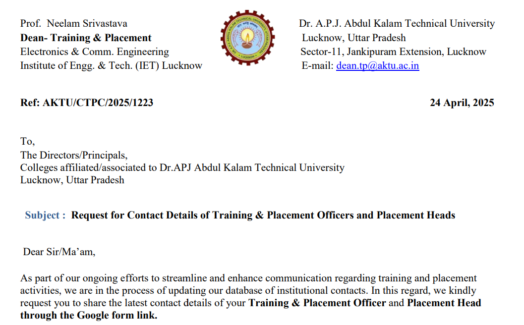 In this regard, we kindly request you to share the latest contact details of your Training & Placement Officer and Placement Head through the Google form link.