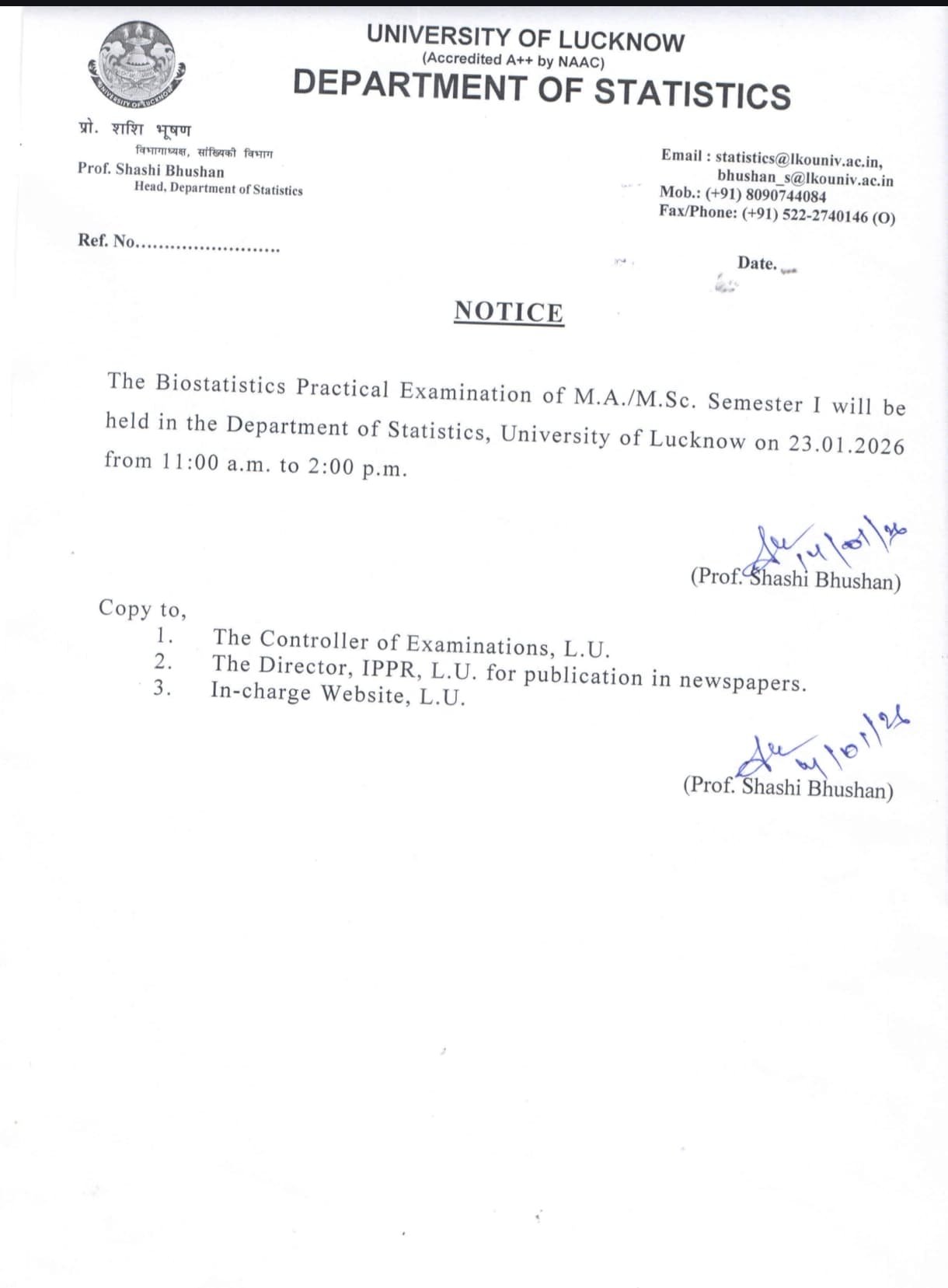 Lucknow University Bio-Statistics Semester I Practical Examination. 2026: Official Notice Released