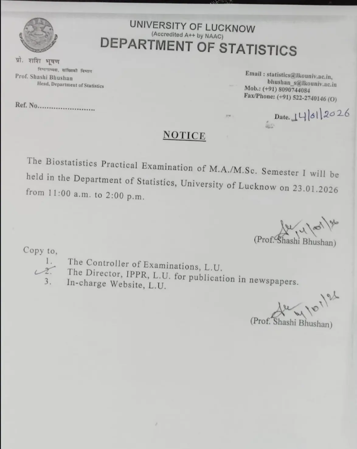 Lucknow University: The university/board has officially released an important notice related to Biostatistics Practical Examination Schedule of M.A./M.Sc. Semester I on its official website. Students who are concerned with this update are advised to read the complete notice carefully.