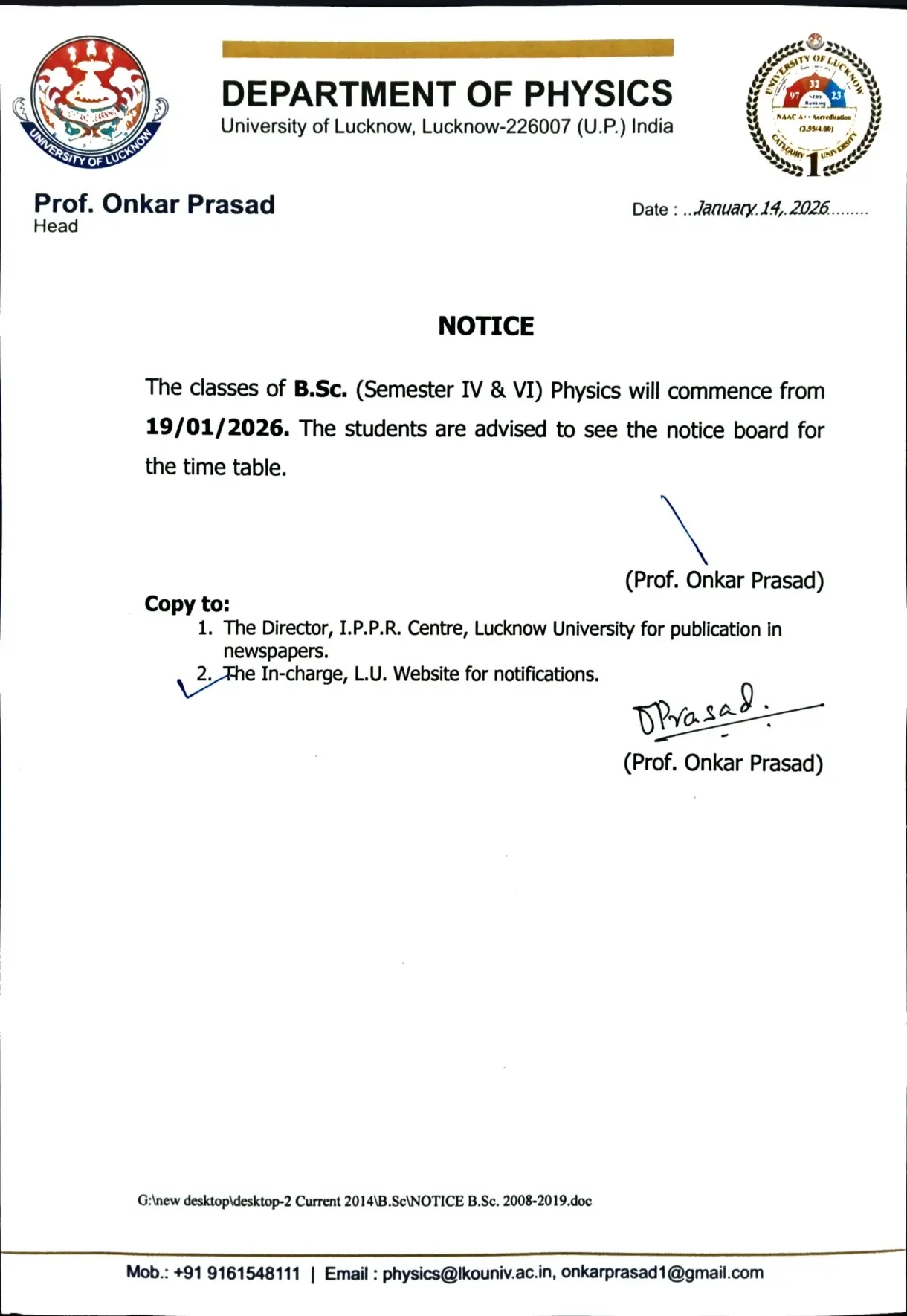 | Notice Related To | Commencement of B.Sc. Physics Semester IV and VI Classes |